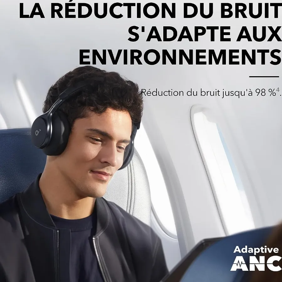 RÉDUCTION DU BRUIT JUSQU'À 98 %* : la réduction adaptative du bruit détecte les sons externes et les fuites sonores, avec un étalonnage automatique pour une réduction optimale du bruit. Échappez aux distractions indésirables dans un train bruyant, dans un café animé ou si votre casque ne repose pas correctement sur vos oreilles. *Testé par soundcore dans des conditions de laboratoire.
